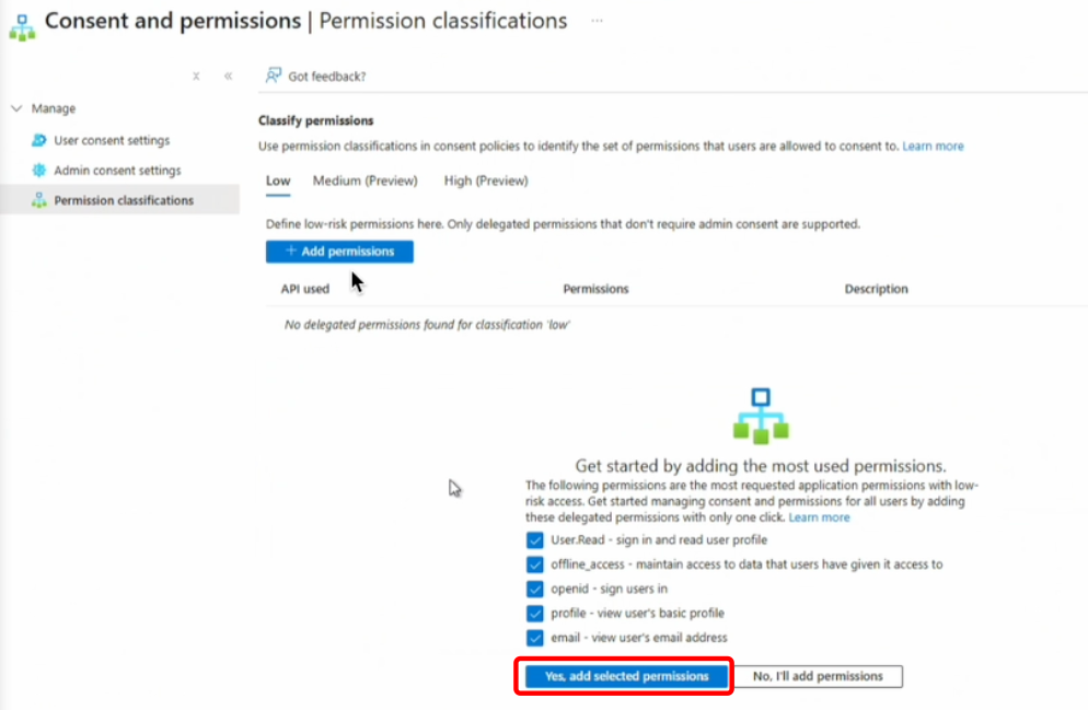 In Permission classifications, add more “Low” permissions as suggested by Microsoft.Common low permissions: