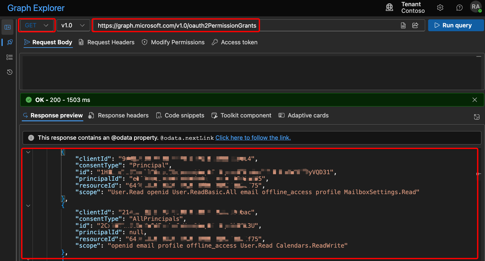 Method Description Output GET Retrieves a list of OAuth 2.0 permission grants, or details for a specific one See all granted app consents in a tenant POST Creates a new OAuth 2.0 permission grant Grant permissions programmatically PATCH Updates specific properties of an existing permission grant (e.g., scope) Change the permissions granted to an app DELETE Deletes (revokes) a permission grant, removing app consent Remove OAuth consent for an app from the tenant