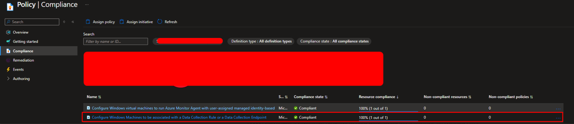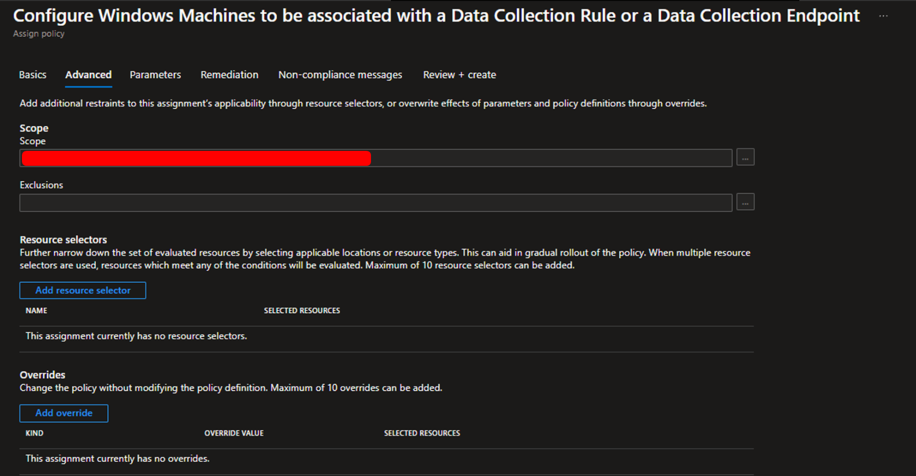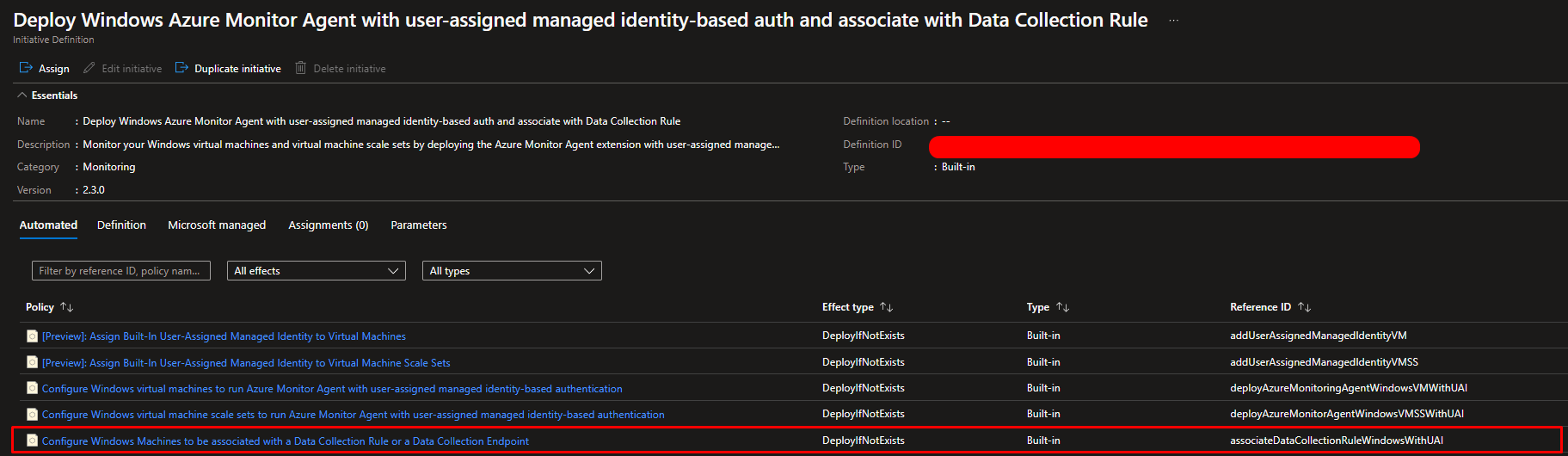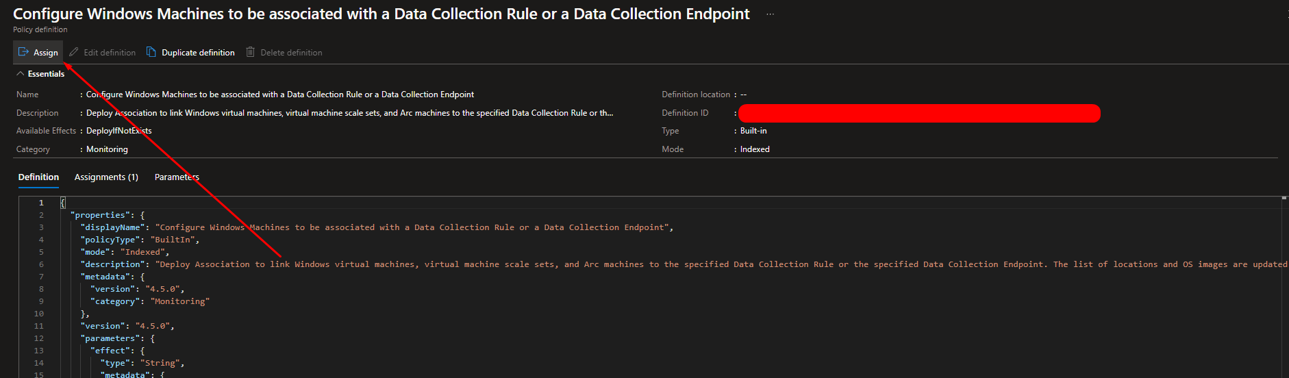 Policy for Assigning Data Collection Rules (DCRs): This policy is responsible for applying the appropriate DCR to each VM. It guarantees that the data collection settings are consistently applied, enabling accurate and comprehensive monitoring.