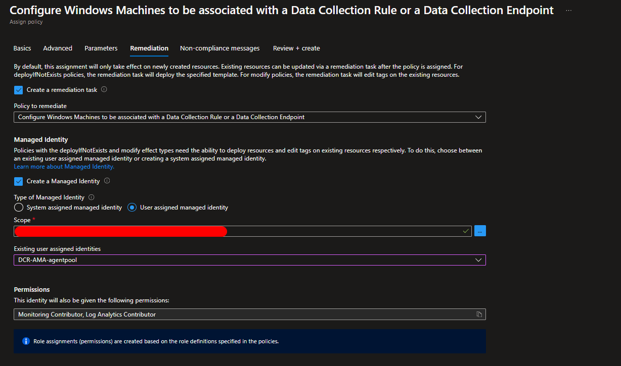 In the Remediation tab, enter a user-assigned managed identity and check the box for “Create Remediation Task.” This will ensure that the policy uses the specified identity and sets up a remediation task if needed.